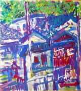 | 昭和6年の夏、江澤館に滞在した安井画伯は、作風が調子づいた43歳であった。四階の一室からの眺望を好み人も近づけずにこもり、眼下の海風を写生した。 安井画伯の風景画では代表作の「外房風景」はこうして生まれた。いまこの部屋の北側の出窓をあけると、窓辺の植えこみ越しに、半世紀後の「外房風景」がみえる いま大原美術館に収蔵されている「外房風景」は、横長の白を多用した色調の大作である。夏の陽光をうけた水土と生活が幅広く描かれており、海風さえ感じさせる力作である。昭和6年9月第18回二科展に出品された。 千葉県立美術館 元館長 高橋 在久 |