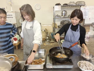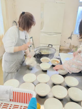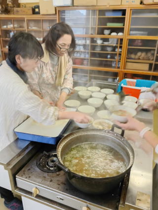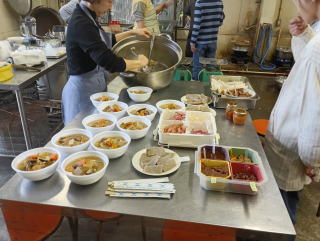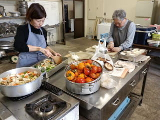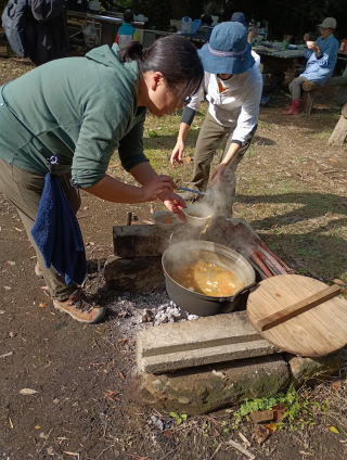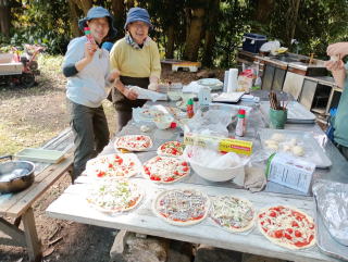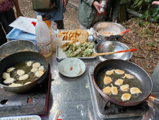 | 「かぶのかき揚げ」「柿の天ぷら」の新メニュも好評? | 里芋いっぱいの「芋のこ汁」温まりました身も心まで | 久しぶりの参加者20人超えで、新米の「塩おむすび」も追加 | 3種のPIZZAにパン・天ぷら・芋のこ汁:いずれも好評の『うまし!!』 |