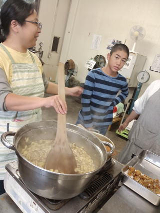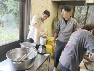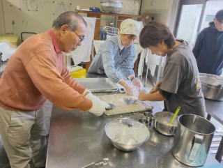 | 10月例会 大雨の予報をうけても雨天強行決断の月例会でした。 急遽、前々日に調理可なる施設を物色し会場を「かあさんの味工場」に変更。 柿もぎの代わりに「柿ジャムやジンジャーシロップづくり」をメニューに追加してのあたふた例会となりました。 が、午前中~pm2時過ぎまでは雨なしで、山の広場でメイン作業の柿もぎや蒟蒻づくりが出来たなぁ~と思わず口にする程の曇天。 でも、『結果オーライ!』?・・・空模様を気にすることもなく作業の気配りに専念できる利点は大きい・・・ので、これからも大雨予報の場合には今回の様に室内作業メインの調理可能な施設を確保して、多少メニューを変更し予定日に「雨天決行」もありで臨もうか思った次第であります。 思えば・・・今までに百姓塾で使用したそうした施設は、近隣