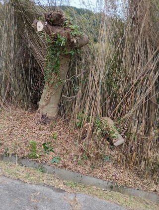 | 狙い通りにログテーブルとログテーブルの間に倒せました。が、枯れた雑木は硬くカットが大変 | 10/26の 蒟蒻イモ掘りに向けて草刈り名人の黒川さんが奮闘 | |