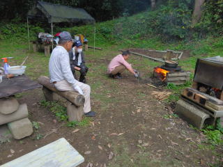 | 例によって、炎が大きくならないよう集めたごみを分散して燃す | お昼には、焼きおにぎりに焼き椎茸 | 山のアワビ: 肉厚の「肉丸」種 故にぶ厚く大きくなってます。 | シイタケ狩り担当は・・・シイタケ採り名人のはるちゃん |