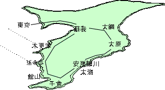 フェリーで・・・ ●久里浜港→東京湾フェリー(1日21便、所要時間35分)→浜金谷港 ●料金;航送料金3,880円(車両全長5m、大人1人含む)('02.8現在) ※便数は、変更の場合があるので時刻表などでご確認ください。
