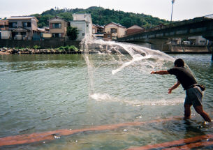 川の河口で午前10:00位から1時間程度やっています。ボラ、ハゼなどが入ります。投げ方をお教えして実際投げていただいています。小さなお子様は網を引くだけの体験もできます。大人500円子供250円です。また、秋は投網で捕れた魚をランチにして食べる投網ランチ(大人1000円子供500円)の企画をしています。要予約。