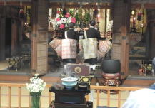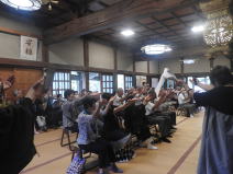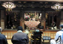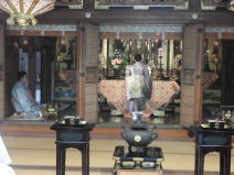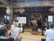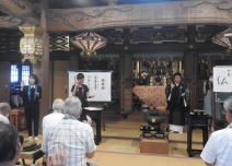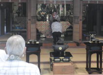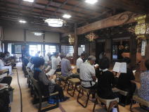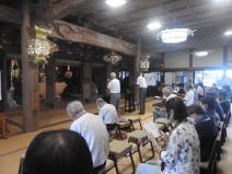![]() 本堂で讃仏偈をお勤めし、 平野ご住職のあいさつを受ける |