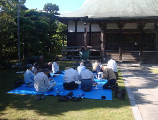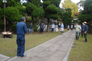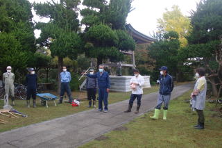 ![]() 三平会長:あいさつ&作業分担 住職:「お怪我のないように」 |