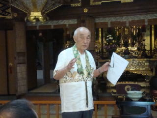 ![]() 講演:光明寺住職で、現在本願寺総長でもある石上智康(いわがみ ちこう)師が「生きている今も死ぬ時も腹はすわっていない。それでいいのです」、 |