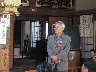 ![]() 記念公開講演は姉崎の弘教寺 小林覚城ご住職が、仏壮から希望した題目「お寺とのつながり」に |