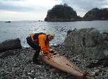 いつもの仲間もいます。ベテラン吉田さんがインデアンカヌークラフトのグリーンランドスタイルの1本ものを持ち込んでいました。ちょっと借りて遊んでしまいました。横になってみます、おーっ、いけるじゃないか、今回はじめて出来ました。本人よりまわりがびっくりしてました。このカヤックはいいカヤックかもしれません。実はヴァージョンアップの作戦としてスケッグというのも造ってあるんですが、無しで使えればそれにこした事はないと保留してあります。穴を今からあけるのも忍びないもんです。